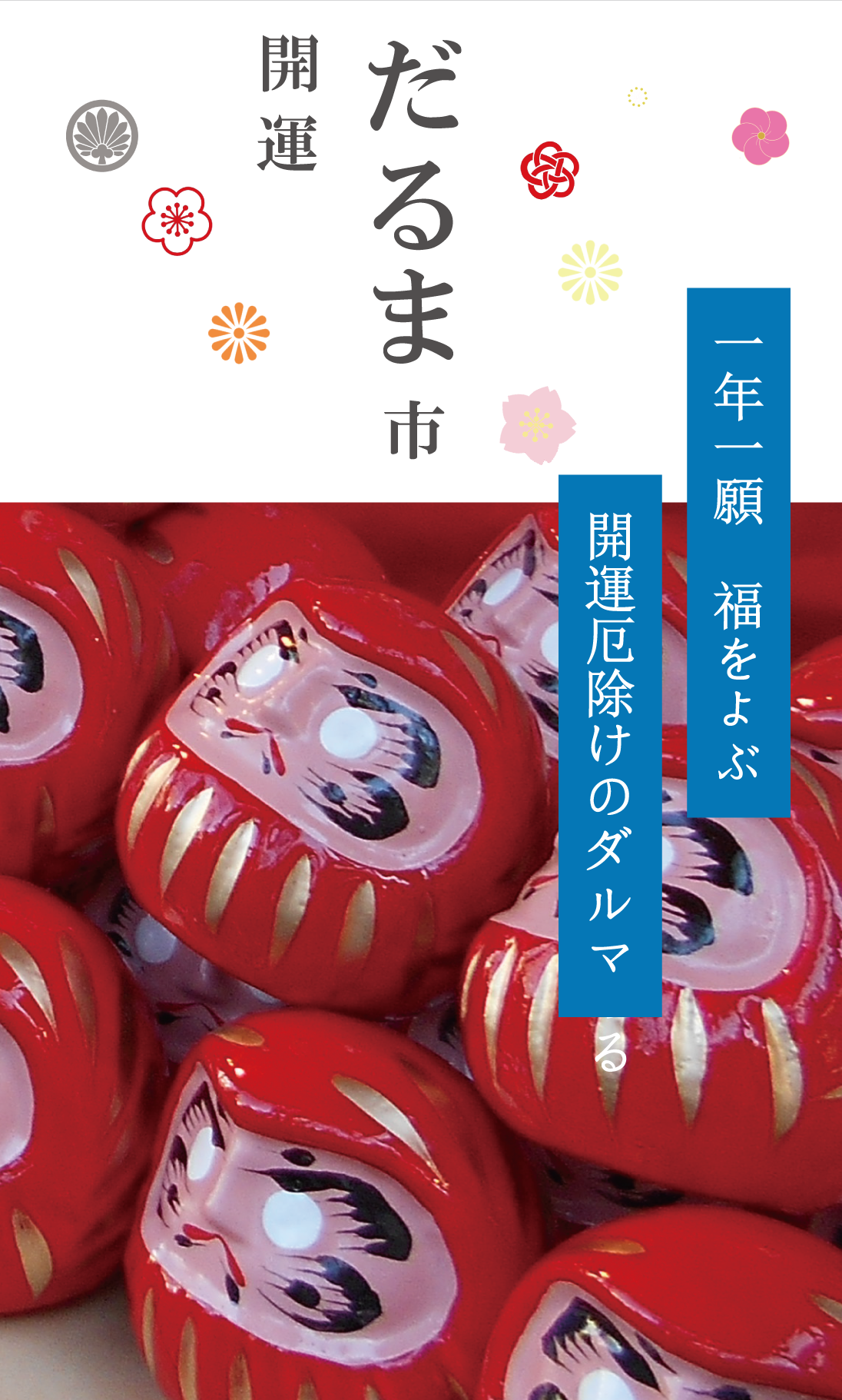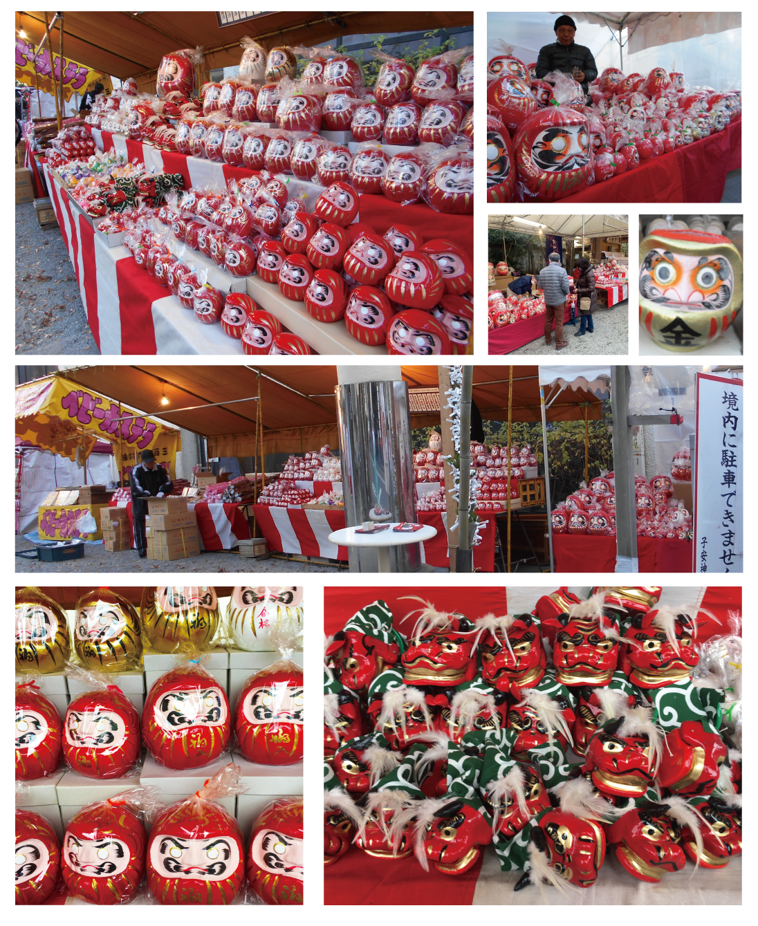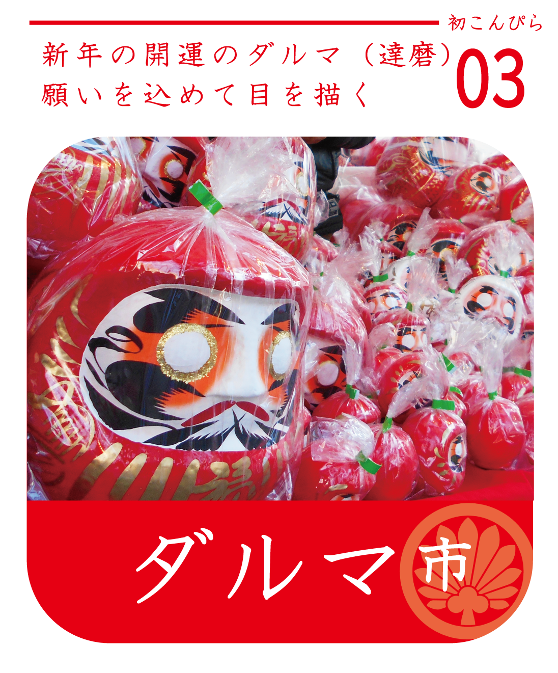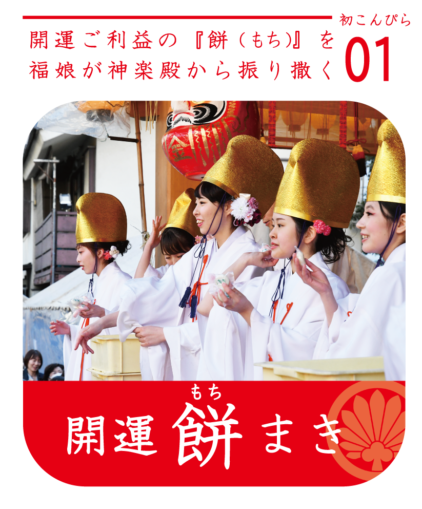 初こんぴら祭での古くより「だるま市」が開催されてきました。バカでかいものから小さくて可愛らしい達磨・カラフルなものまで、実に様々な達磨たちが色鮮やかに並びます。新年の縁起物として日本人に愛されてきた達磨。願い方には地方によって異なりますが、一般的にはご購入後に片目に墨入れし、願いが叶ったのちにもう片一方の目を色付けします。是非お好みの達磨さんに出会ってくださいね。