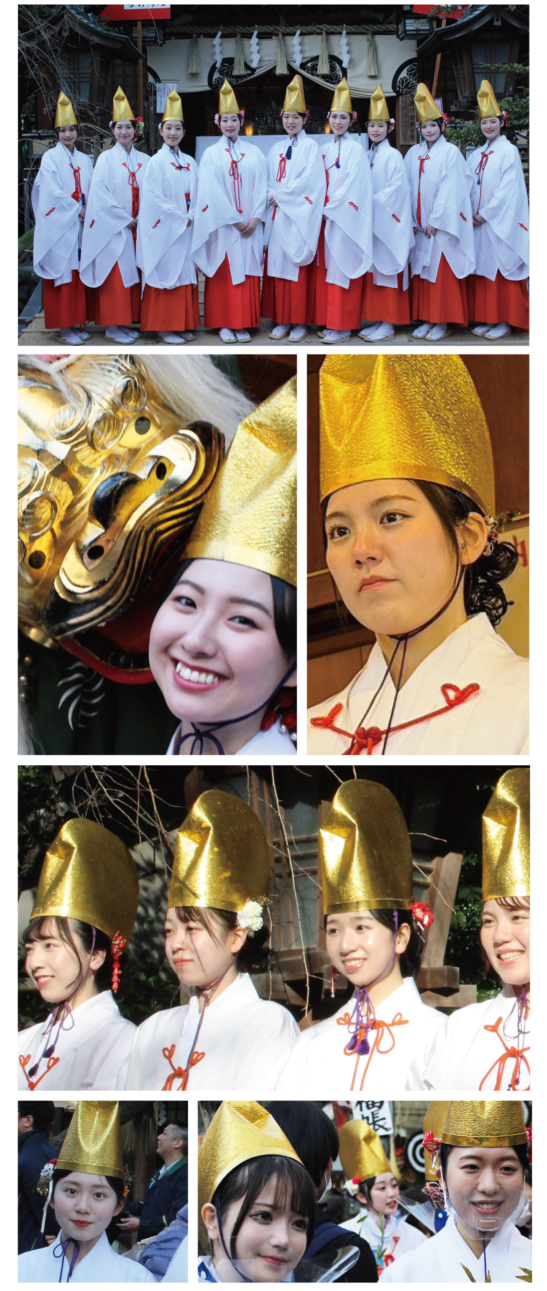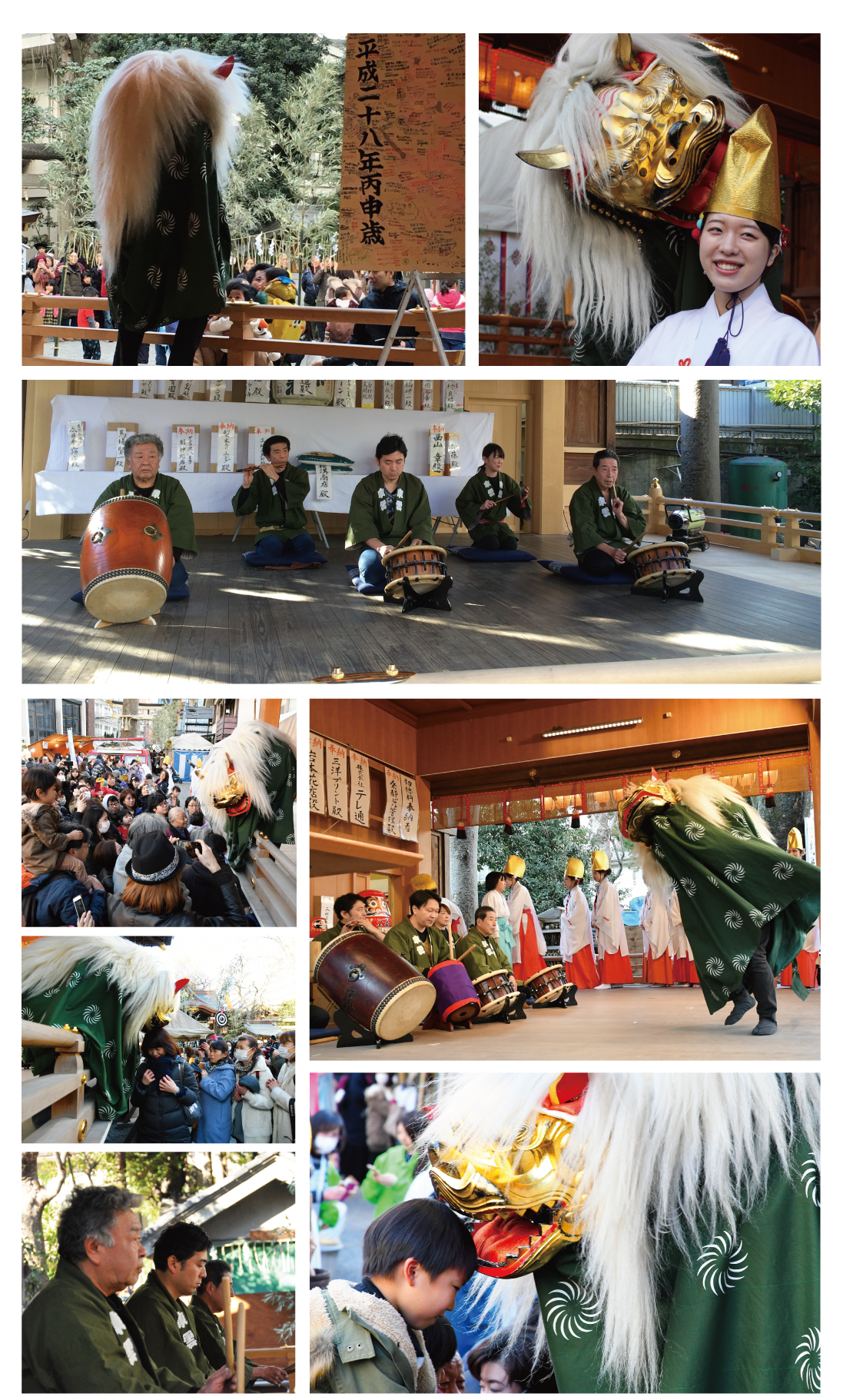 また、お囃子に合わせて艶やかに獅子舞が踊ります。そのお獅子に噛まれるために多くの参拝者がお獅子の前に列をなします。古来よりお獅子に噛まれると魔除けや厄除けのご利益があると言われております。