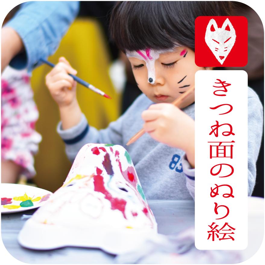 絵柄が付いた狐面が10種類以上あります!ぬり絵をしなくても直ぐに狐に化けられるよ!