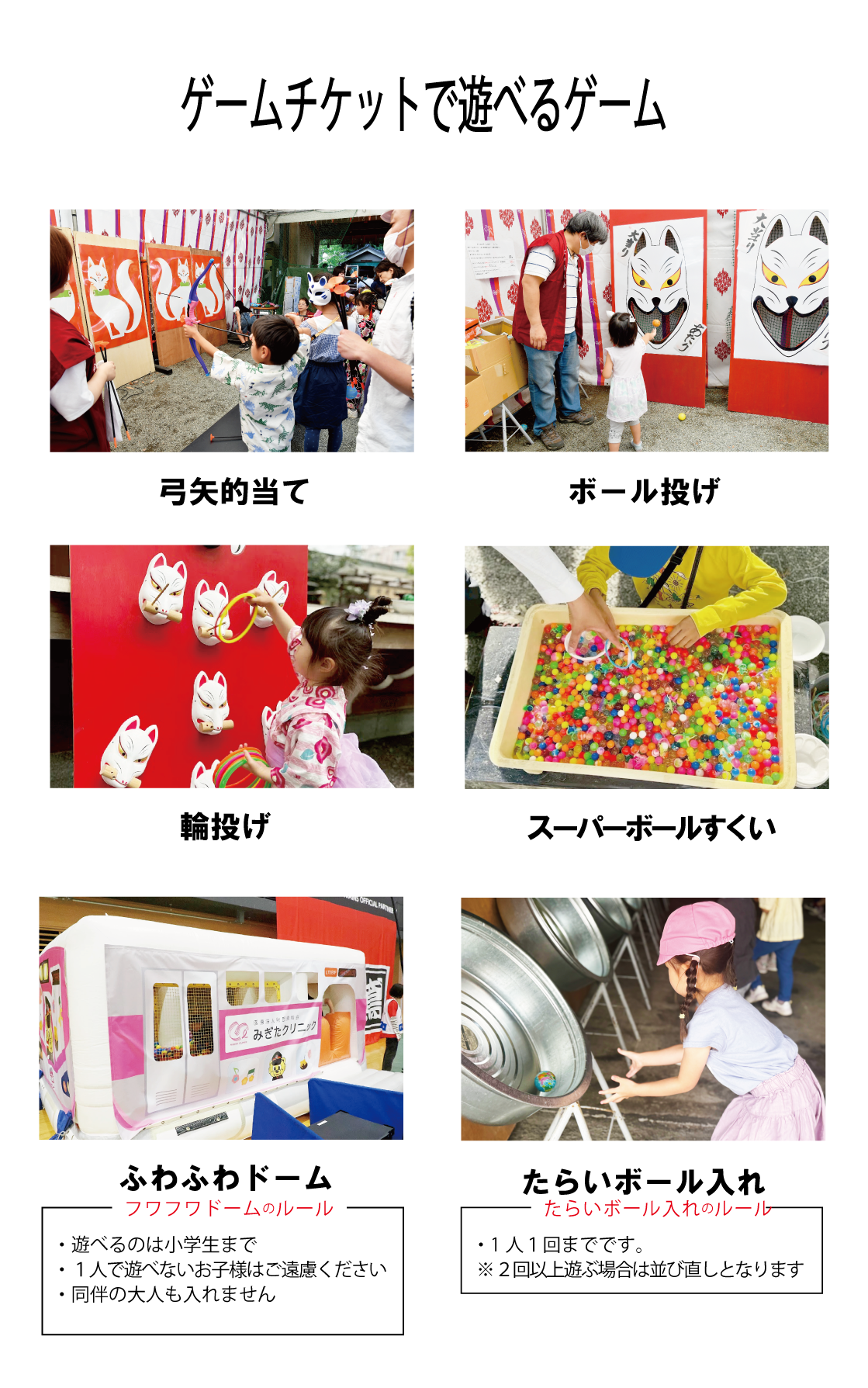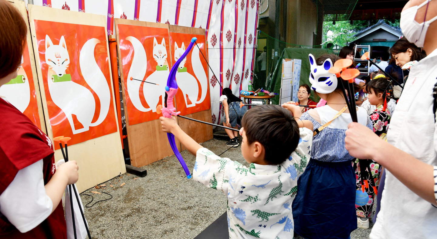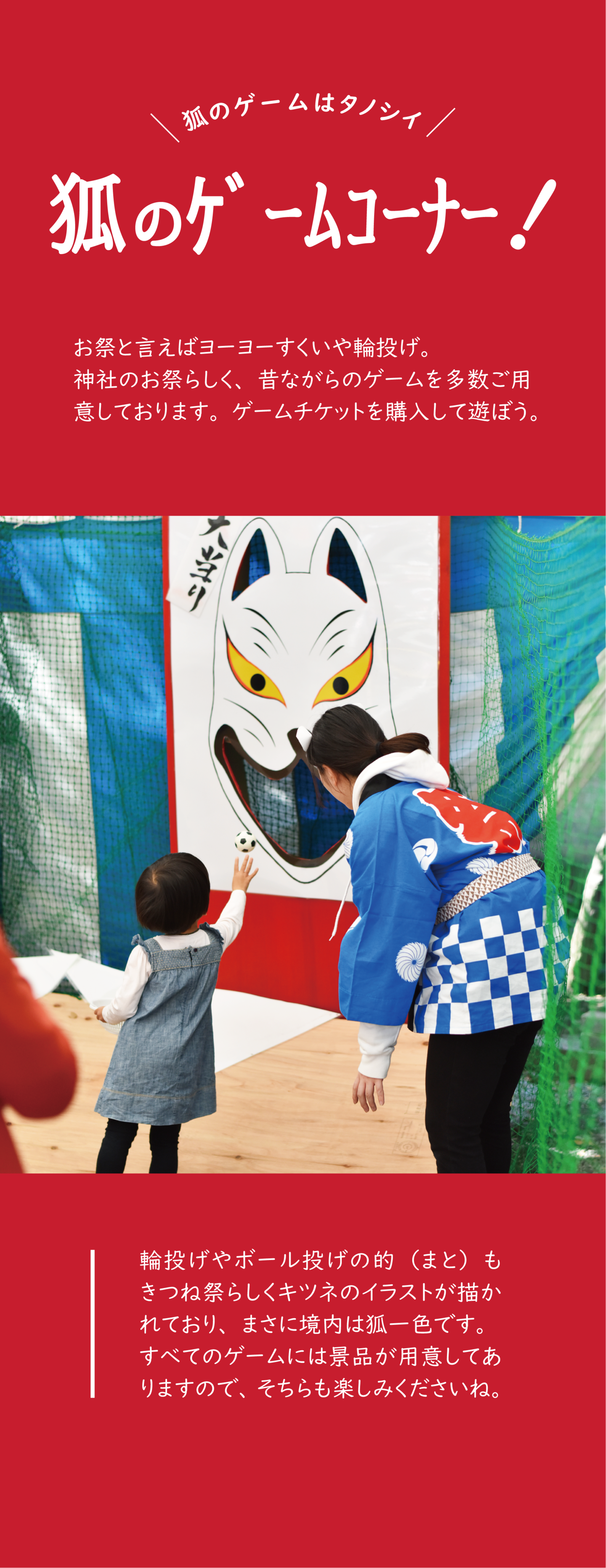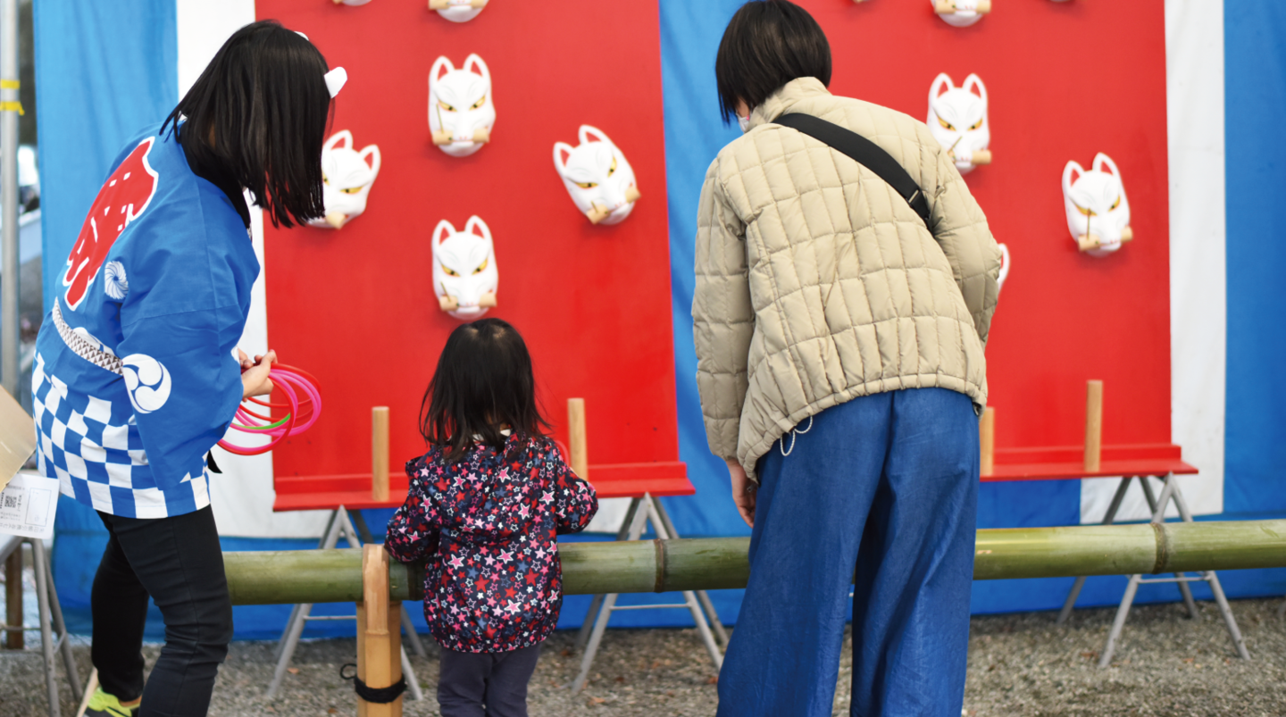 神社内のゲームコーナーでは、神社らしく昔ながらのお祭りの輪投げやボールすくいなどのゲームができます。いざゲームを始めるとお子様も大人も夢中!景品もご用意しておりますので、遊びに来てくださいね。
