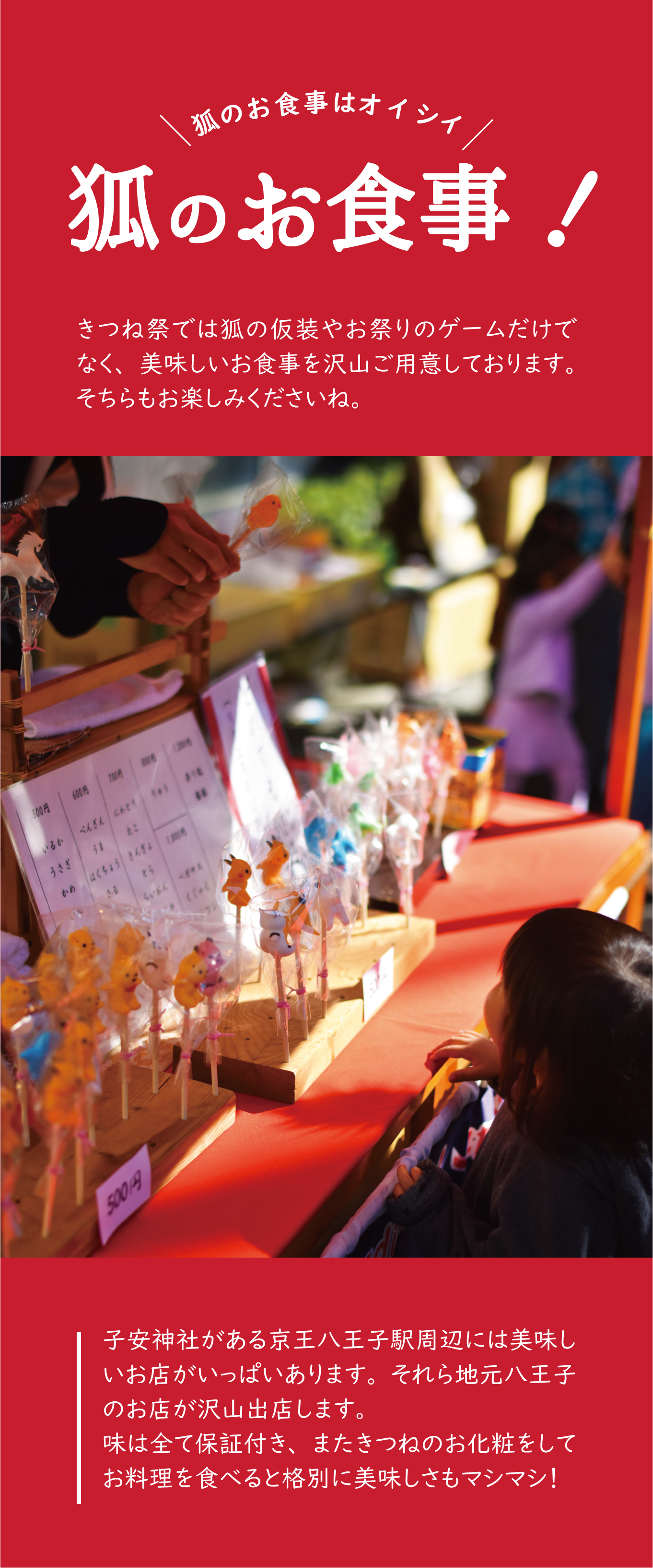 子安神社の周辺には美味しい飲食店が沢山あります。八王子きつね祭ではこれらの地元の飲食店が多数出店致します。狐面のぬり絵をしたり、狐のお化粧をしたり、十分狐を堪能したら、美味しいお食事をとって休憩しよう。