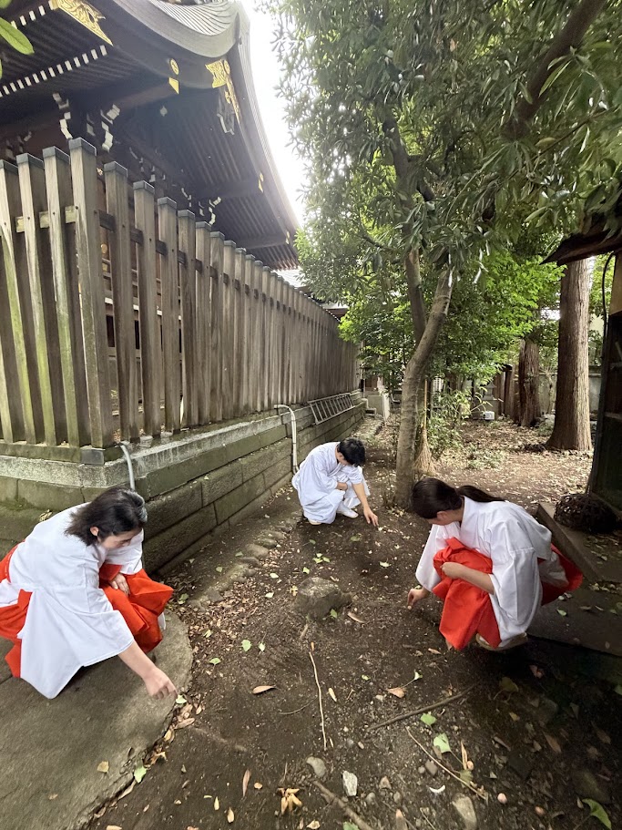 毎年この季節になると、巫女たちが一粒ずつ銀杏を拾い集め、境内を清めながら秋の恵みに感謝を捧げます。