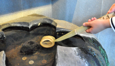 ・安産を願いながら、神水殿のご神水を3回柄杓ですくいます。