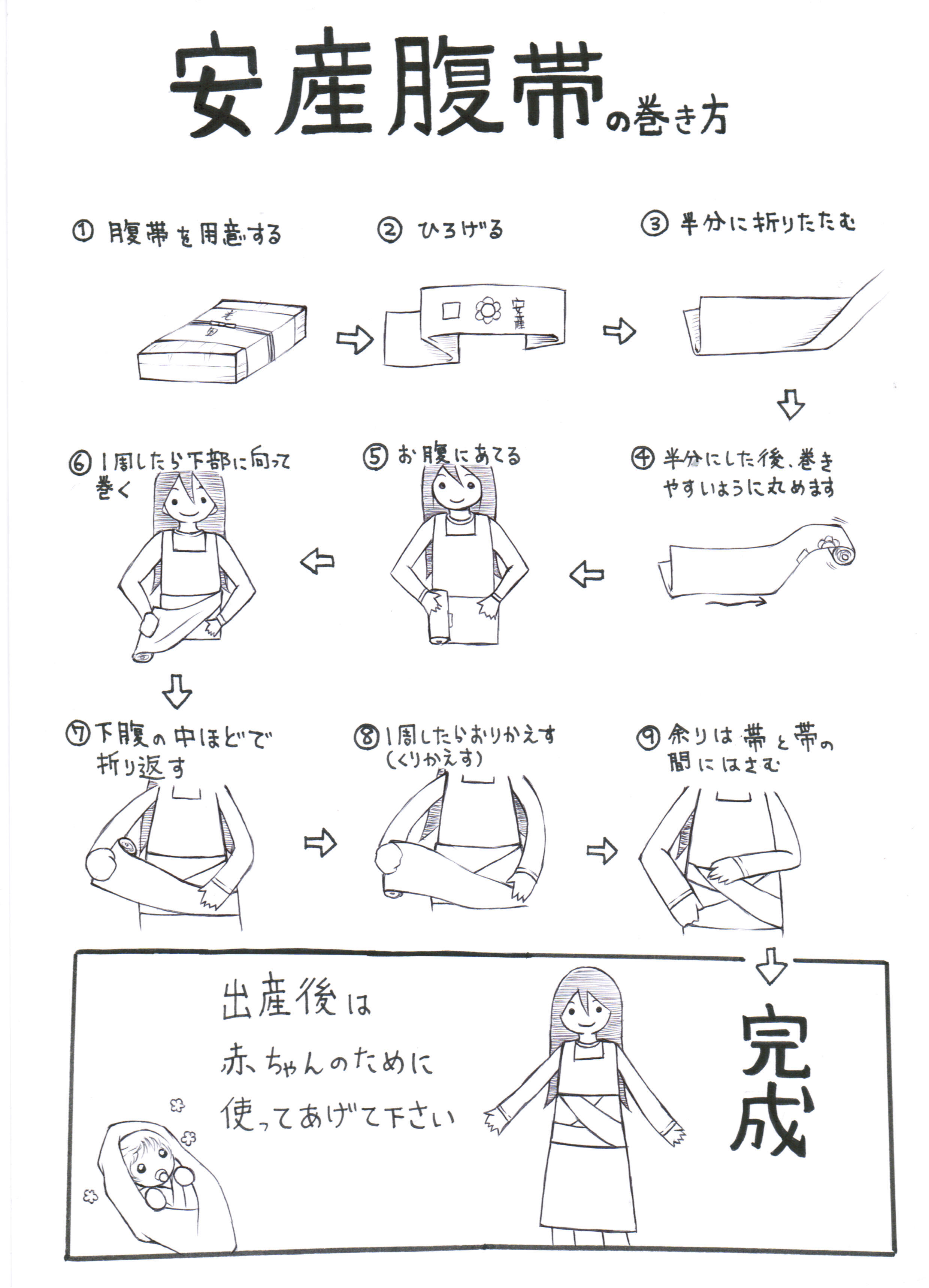 岩田帯(腹帯)は五ヶ月目を過ぎた戌の日に巻いていただきます。出産後には、お母様の体に巻いていただいたものは、赤ちゃんの為に使ってあげると良いと言われていますので、体を拭くのに使ってあげて下さい。