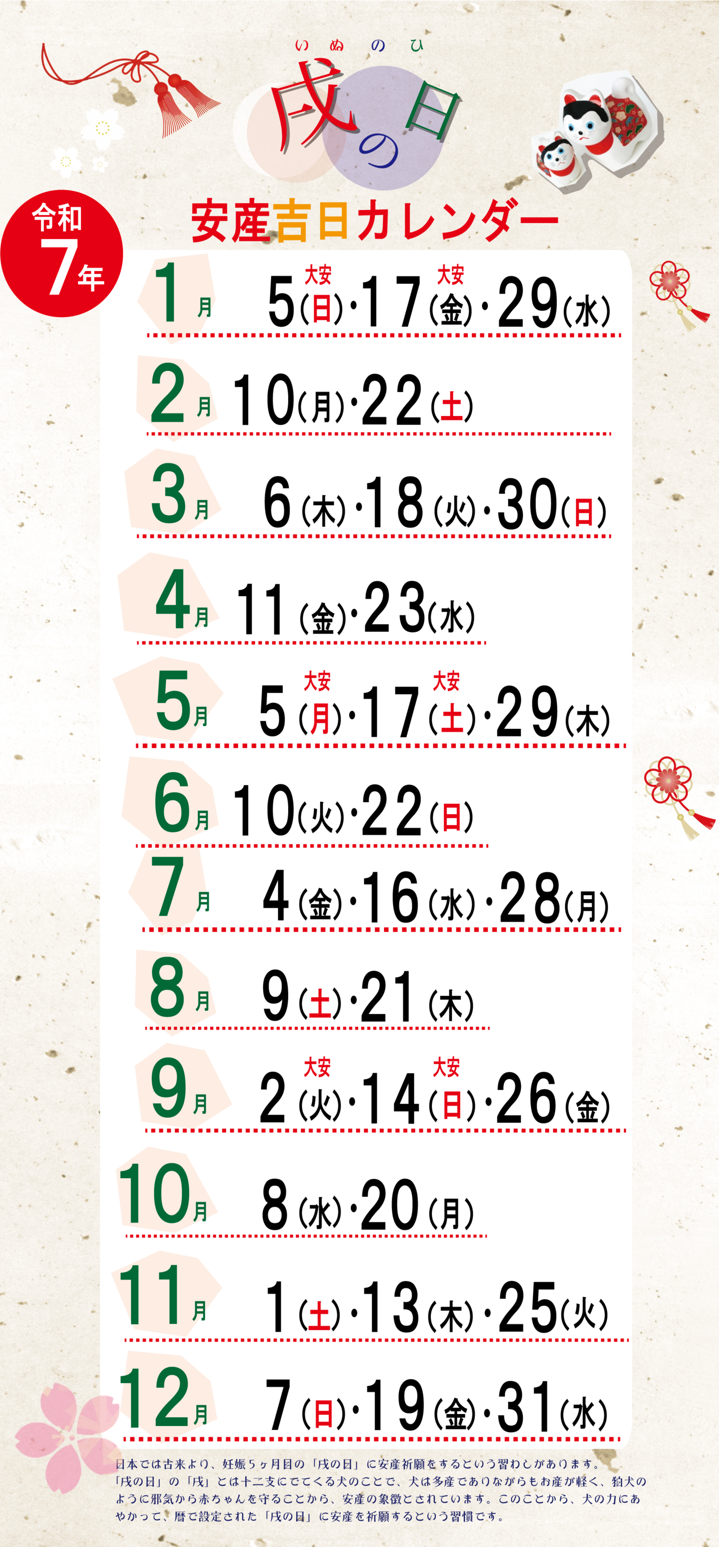 妊娠五ヶ月目を過ぎた戌の日に安産祈願を行い、腹帯を巻くと安産であるという言い伝えがあります。古来より犬は安産であったため、犬にあやかり戌の日に安産のお参りをします。安産祈願は神様に参詣して懐妊の報告と無事出産を祈願する行事です。