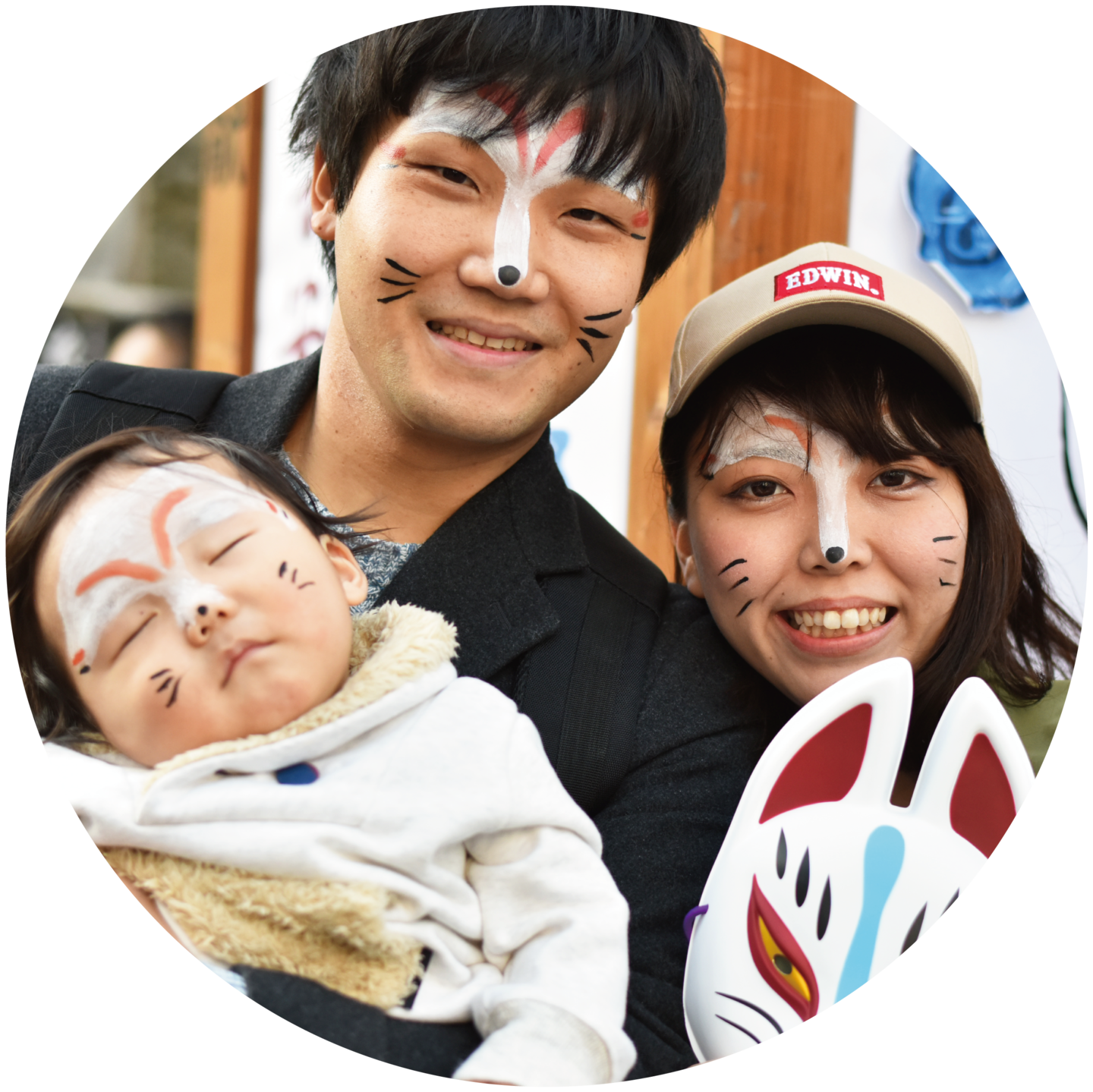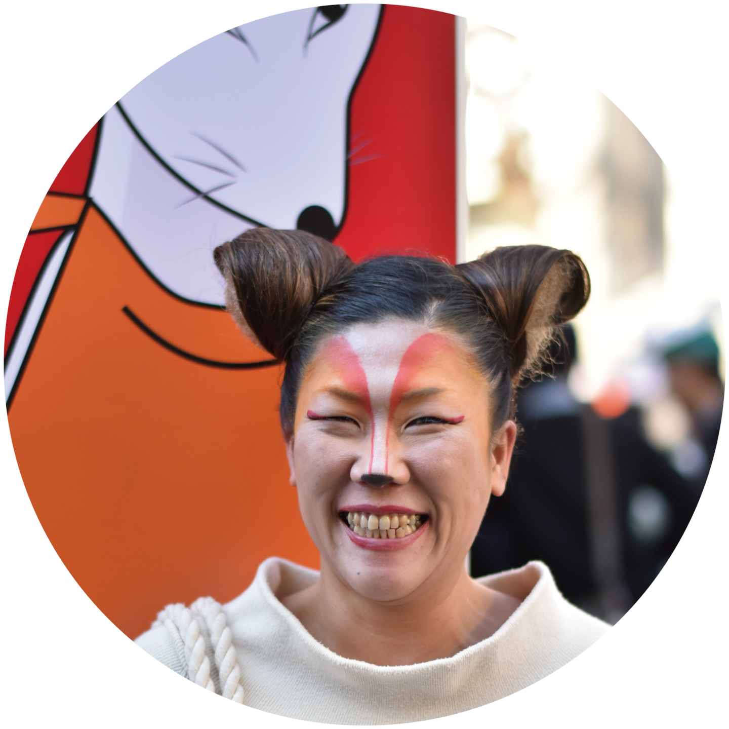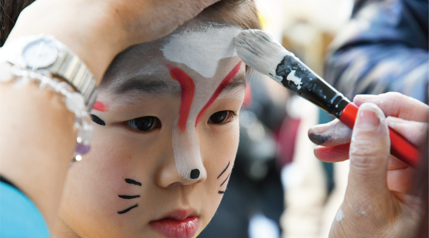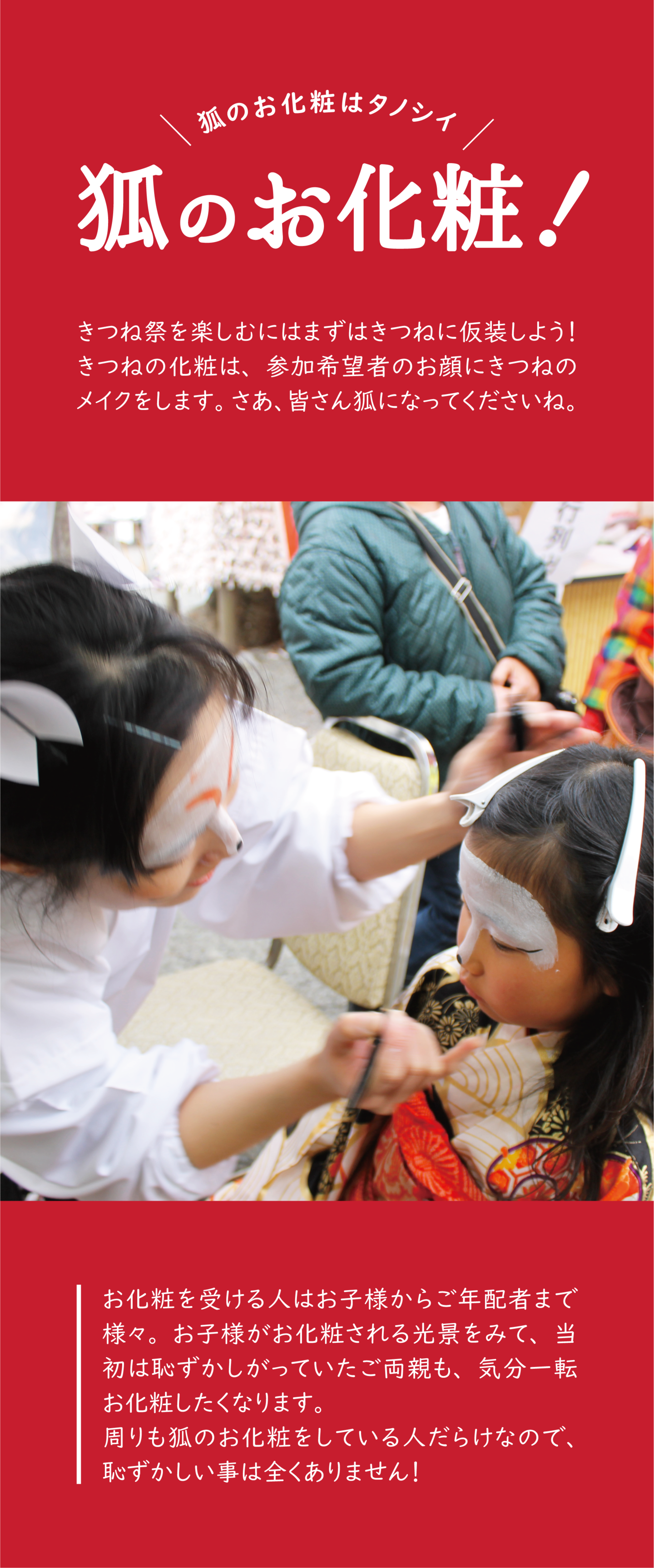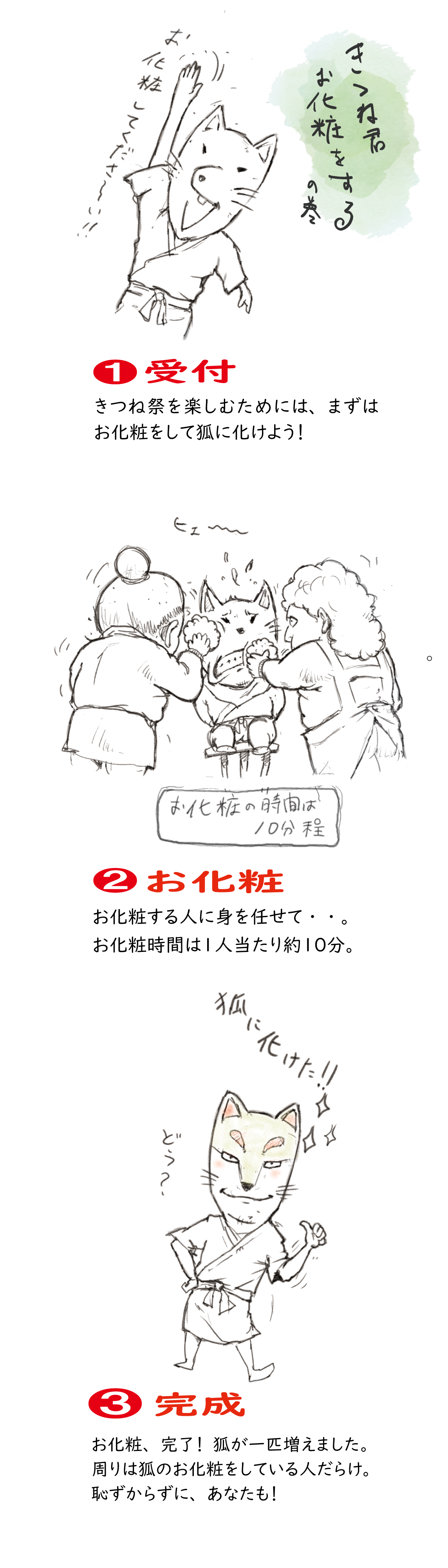 まず顔のおでこから鼻にかけて白の下地を塗ります。次に赤く顔料で目尻と眉の辺りにラインを入れます。最後に黒の顔料で目尻とヒゲを描いたら、もうきつねメイクは完了です。