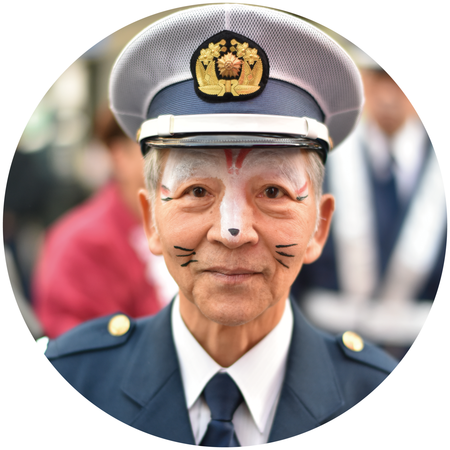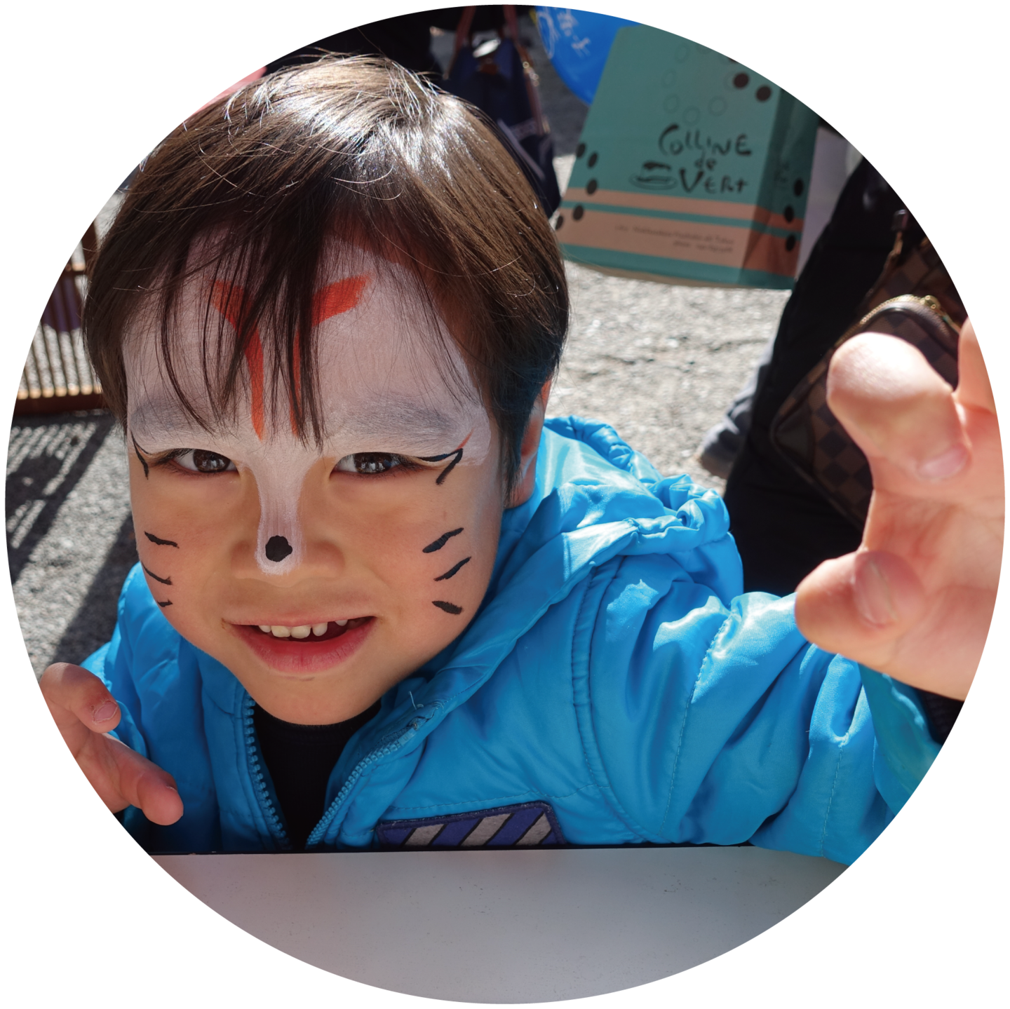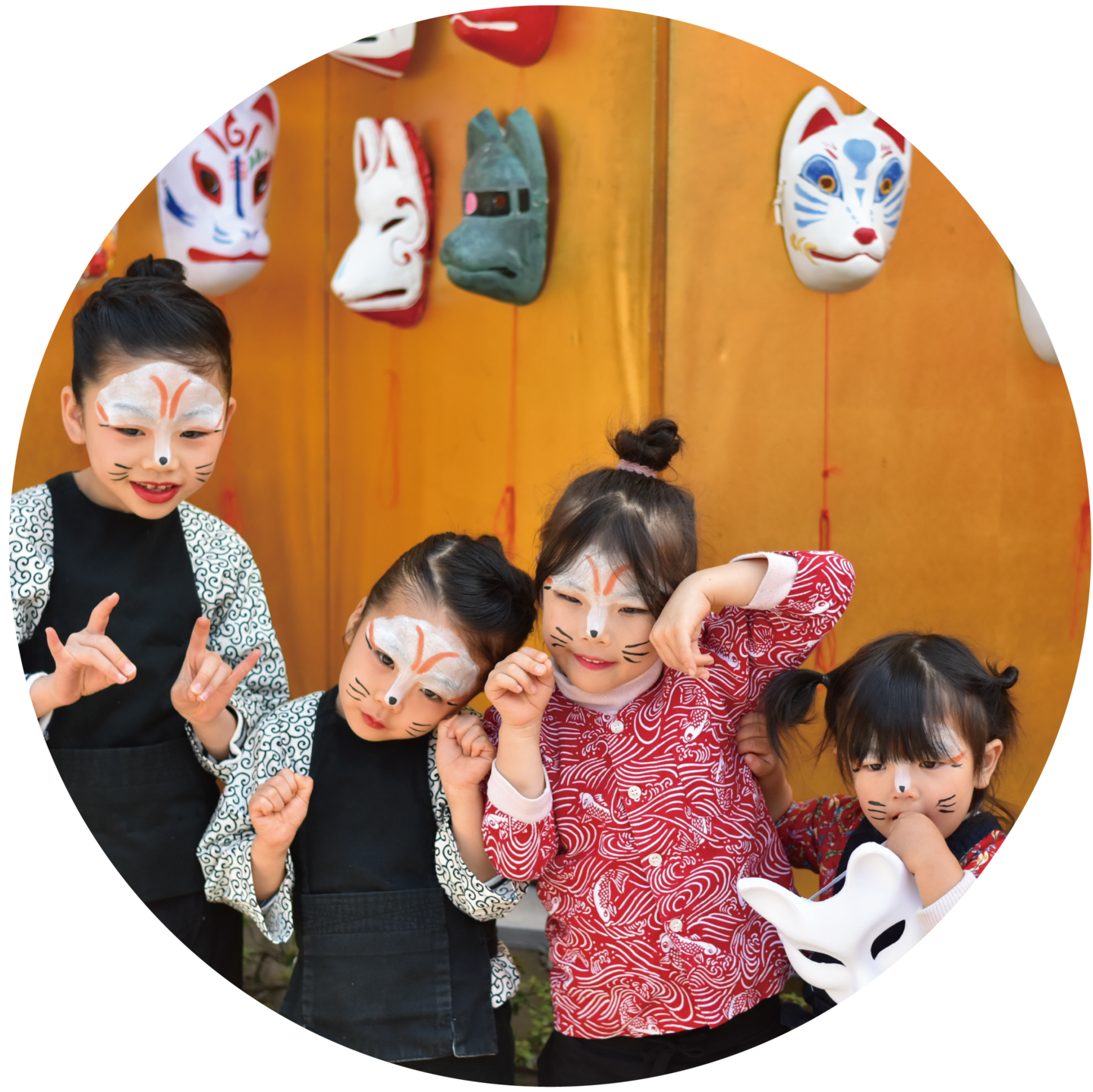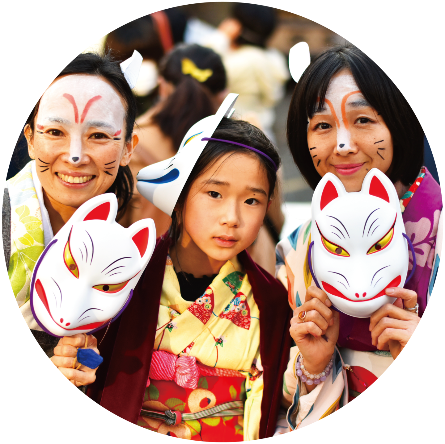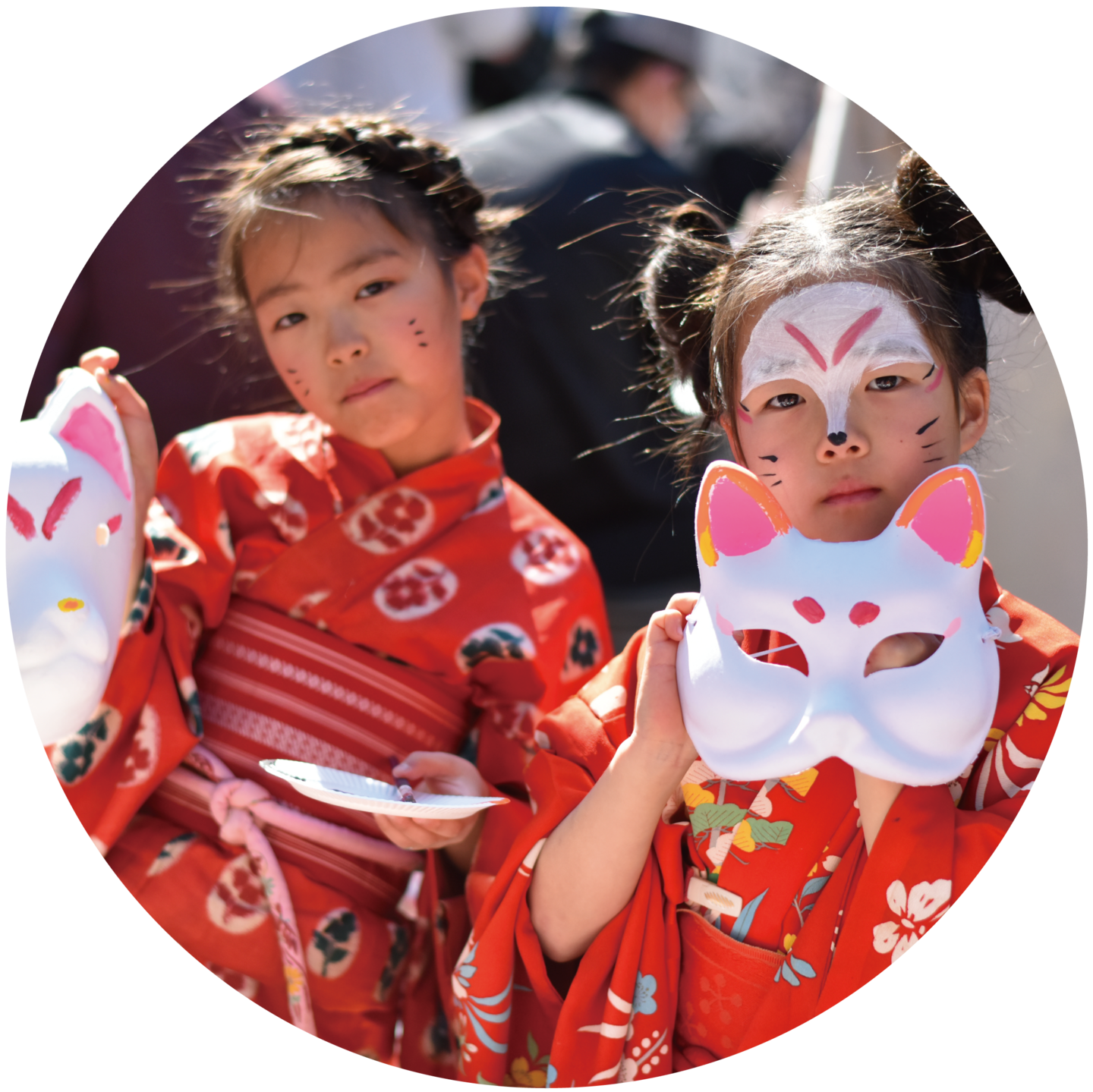 まず顔のおでこから鼻にかけて白の下地を塗ります。次に赤く顔料で目尻と眉の辺りにラインを入れます。最後に黒の顔料で目尻とヒゲを描いたら、もうきつねメイクは完了です。