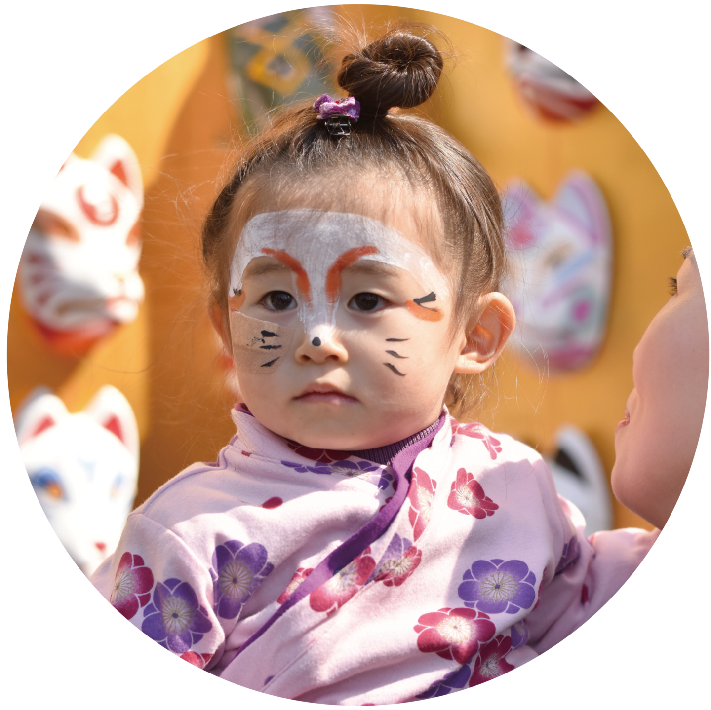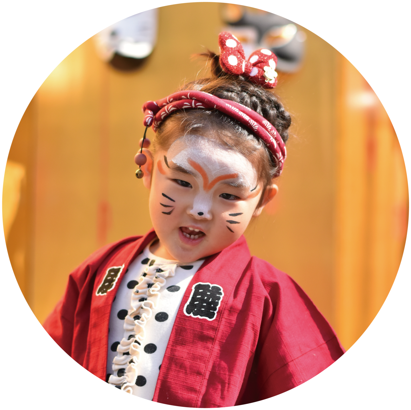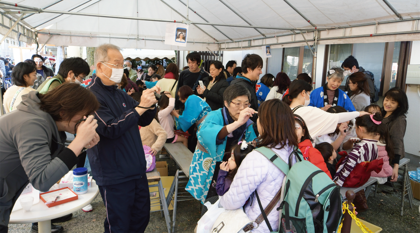 神社内のお化粧コーナーでは、お子様がお化粧を受けている姿をカメラと捉えようと、ご家族様が写真を構えています。またお子様のお化粧が完了すると、パパも「俺もやってもらおうかな。。」と恥ずかしがって躊躇していた化粧を受けたくなります。