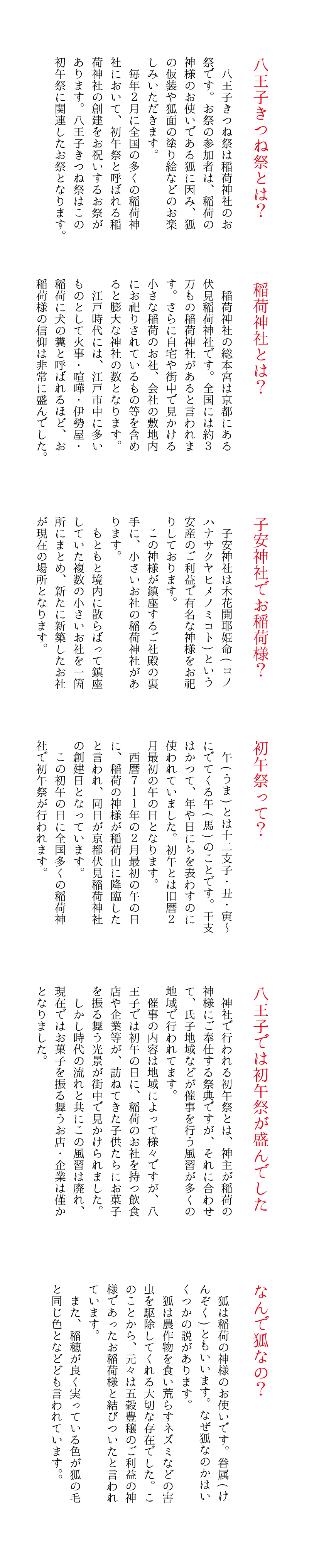「八王子きつね祭」とは稲荷神社のお祭です。毎年2月に全国の多くの稲荷神社において、初午祭と呼ばれる稲荷神社の創建をお祝いするお祭があります。