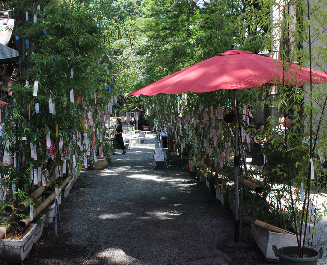 境内に笹を設置します。願いを記帳する短冊をおいてあります。