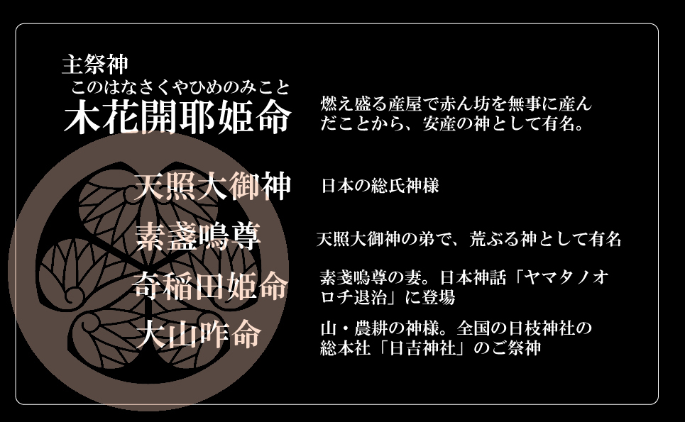 子安神社は天平宝字三年(759年)に橘右京少輔という者が時の天皇のお后さまの安産祈願のために創建したと伝えられています。ご祭神は「木花開耶姫命」であり、神話において、自ら火を放った産屋で無事に出産した神様として知られています。